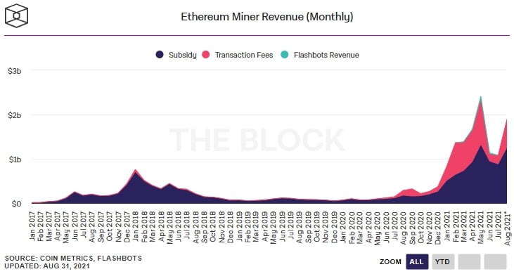 Совокупный доход Ethereum-майнеров в августе достиг $1,65 млрд и на 60% превысил показатель за июль.
