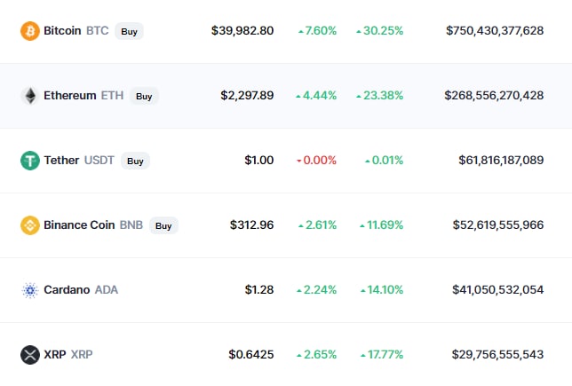 Сейчас Bitcoin стоит $39,982, Ethereum торгуется на уровне в $2,3, цена Binance Coin составляет $313, Cardano - $1.28 и XRP $0.642.