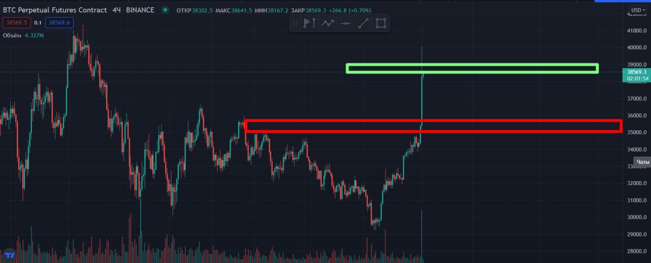 Как мы упоминали в этом посте, основным условие для продолжения роста BTC являлся закреп выше отметки в 38200$ на 4Ч ТФ (4-ех часовой timeframe), что и произошло.