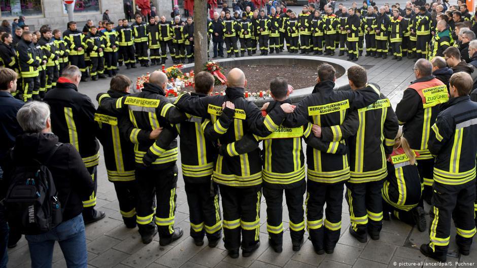 Ну и, наконец, подростки. Драку (если ее можно так назвать) отлично зафиксировали несколько камер наблюдения. Задержано уже семь человек, все они родились в Аугсбурге, преимущественно в семьях мигрантов. У нанесшего удар (ему 17 лет) кроме немецкого есть еще турецкий и ливанский паспорта, у его приятеля итальянское гражданство. Тут не обвинишь беженцев, не обвинишь иностранцев (хотя правопопулисты и пытаются), все подозреваемые выросли в Германии, ходили в немецкие школы. Пресса говорит о сложном "социальном бэкграунде" подростков, проблема есть, кто же спорит, но кому от этого легче. Рождество, елки, глинтвейн - и тут такое. Ну и посмотрите на аугсбургских пожарных на акции в честь погибшего товарища. Фотография лучше любых слов.