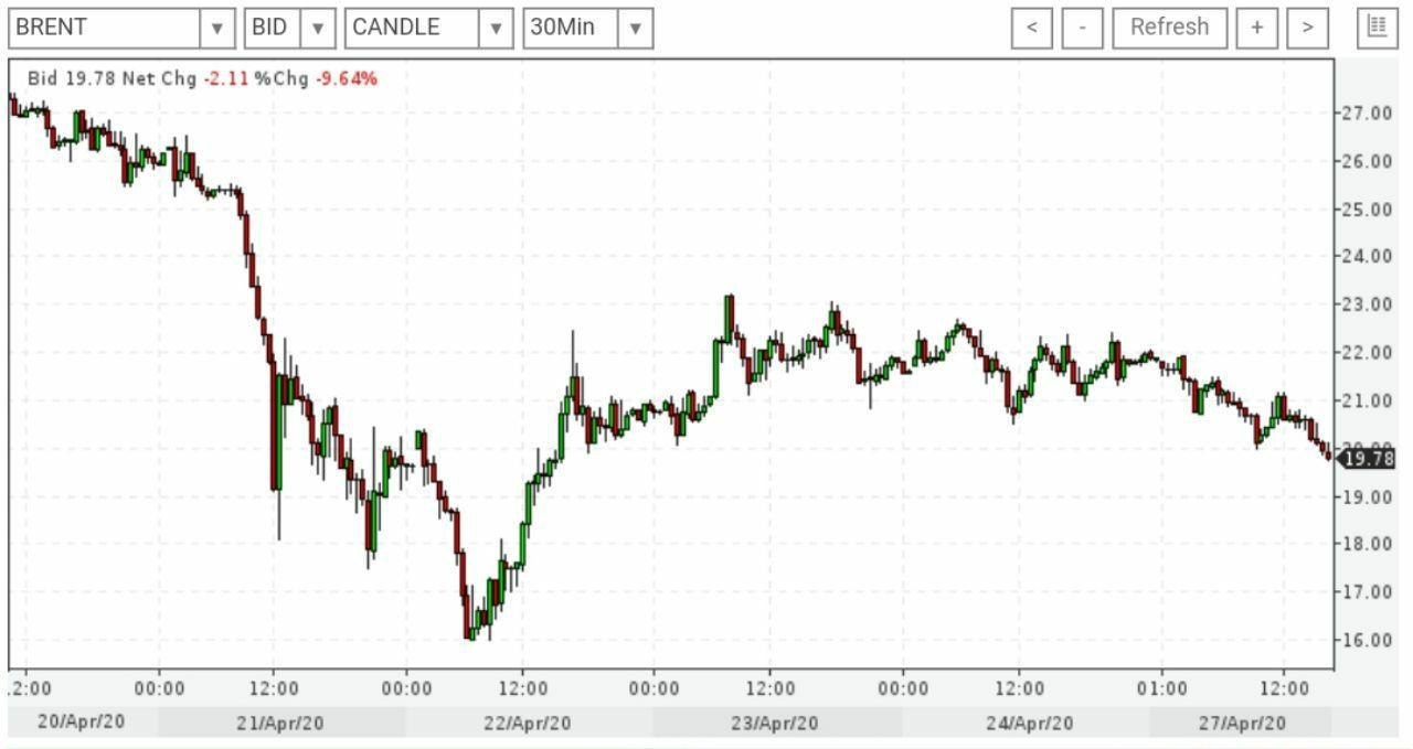 Июньские фьючерсы на американскую легкую нефть WTI упали на 20,13% до $13,53 за баррель к 15.00 МСК, в то время как Brent сбавила 5,78% до $20,20 за баррель.