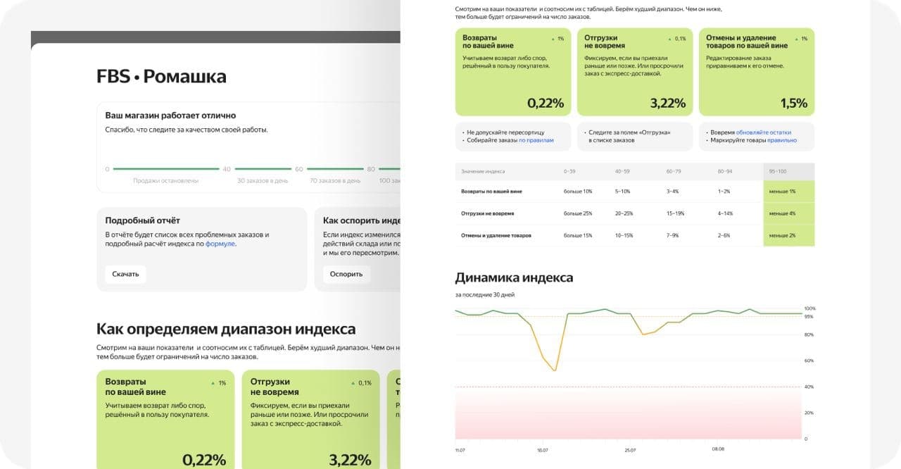 Сервис показывает, как изменился рейтинг за последний месяц и как на него повлияли разные факторы: часто ли продавец удаляет товары из уже сделанных заказов пользователей или отменяет полученные заказы, насколько своевременно отгружает товары, как часто клиенты возвращают товары по вине магазина. На основе статистики маркетплейс подсказывает, над какими факторами продавцу стоит поработать, чтобы улучшить рейтинг.