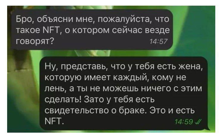 NFT (от англ. Non Fungible Tokens) — это уникальный невзаимозаменяемый цифровой ключ, созданный на основе криптовалюты. NFT не может быть уничтожен или заменен на другой такой токен. Он представляет собой некий сертификат уникальности и неповторимости какого-либо цифрового объекта.