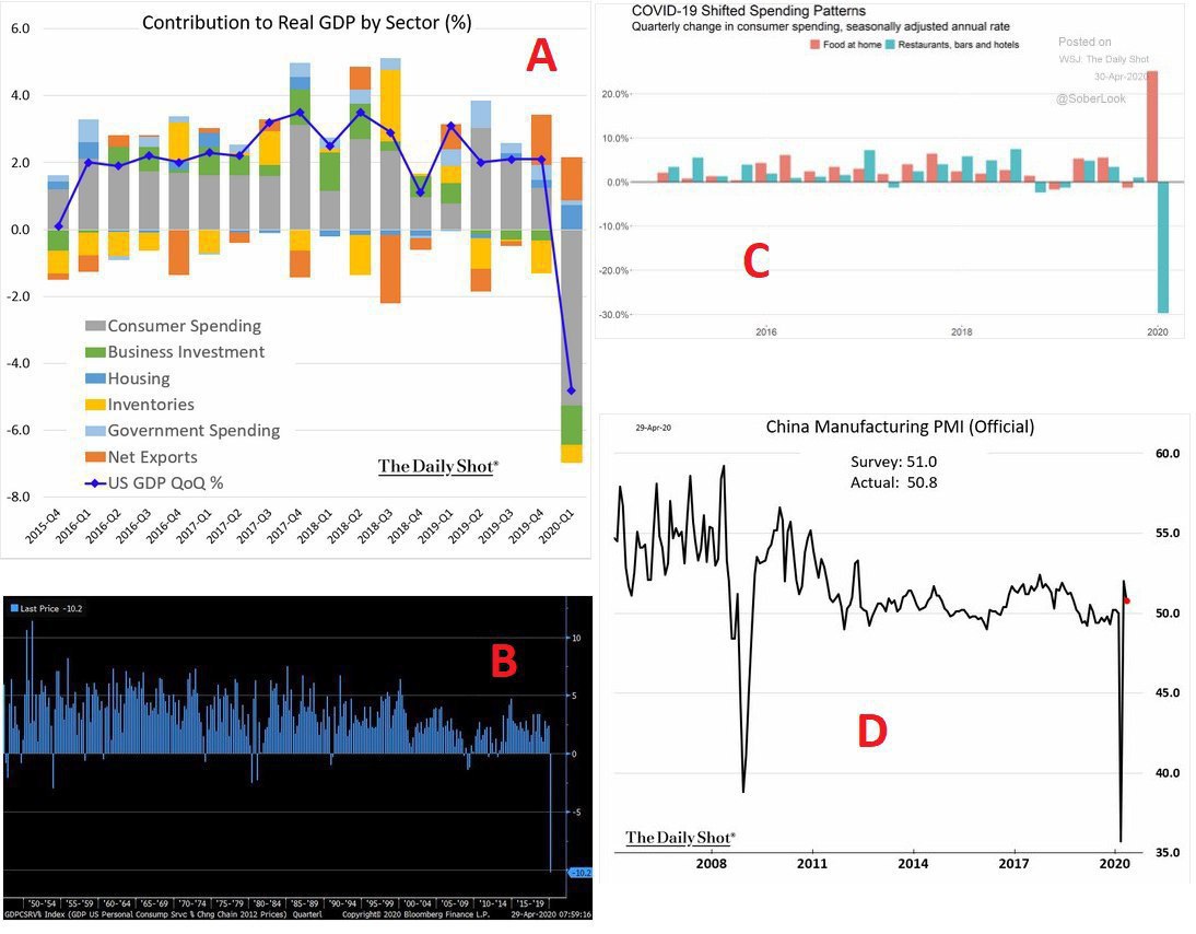 ↖️ Левый верхний график ("А") — динамика американского ВВП по кварталам с разбивкой по составляющим. Первый квартал 2020 года — минус 7%, основная "гиря" это упавшие потребительские расходы.