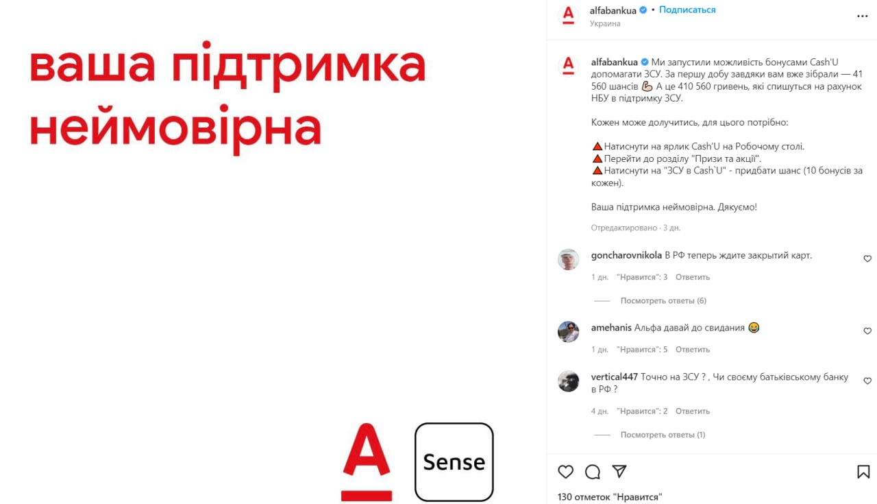 Альфа-банк запустил специальную программу помощи Вооружённым силам Украины (ВСУ). Суть программы – финансирование украинской армии бонусами и прямыми переводами, что идёт вразрез с недавним заявлением владельца кредитной организации Михаила Фридмана о желании скорейшего окончания кровопролития.