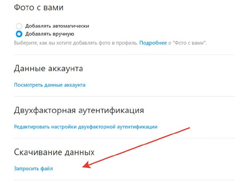 📲 В Инстаграм заходим в “Профиль”/“Конфиденциальность и безопасность” и находим в списке “Скачивание данных” и выбираем «Запросить файл» и указываем почту, на которую его отправят (обычно занимает двое суток)