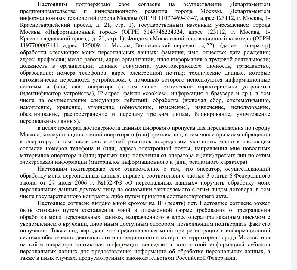 Внезапно выяснилось, что в согласии на обработку персональных данных на сайте проверки пропусков в Москве нашли разрешение на отправку рекламы в течение 10 лет.