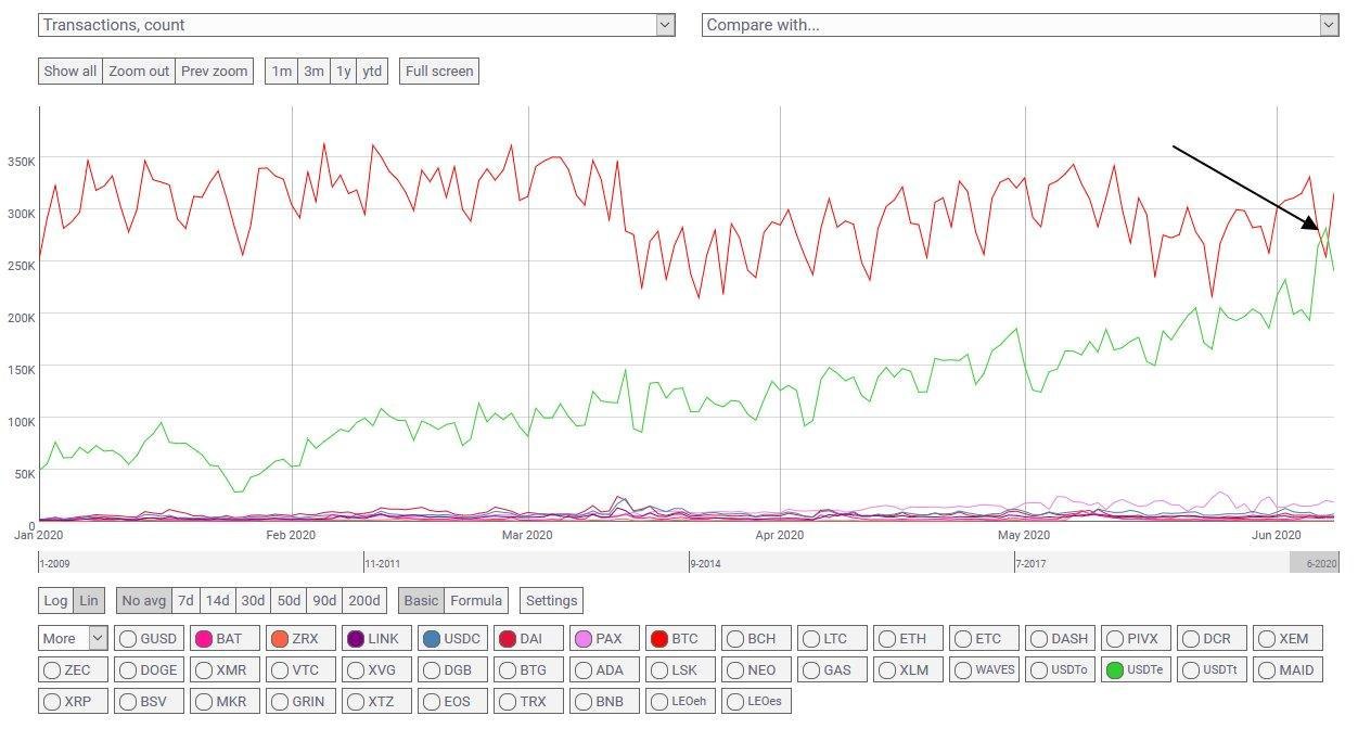 Вчера был примечательный день, впервые количество транзакций в USDT превысило количество транзакций в Bitcoin (282k vs 254k). Это показано на скриншоте.