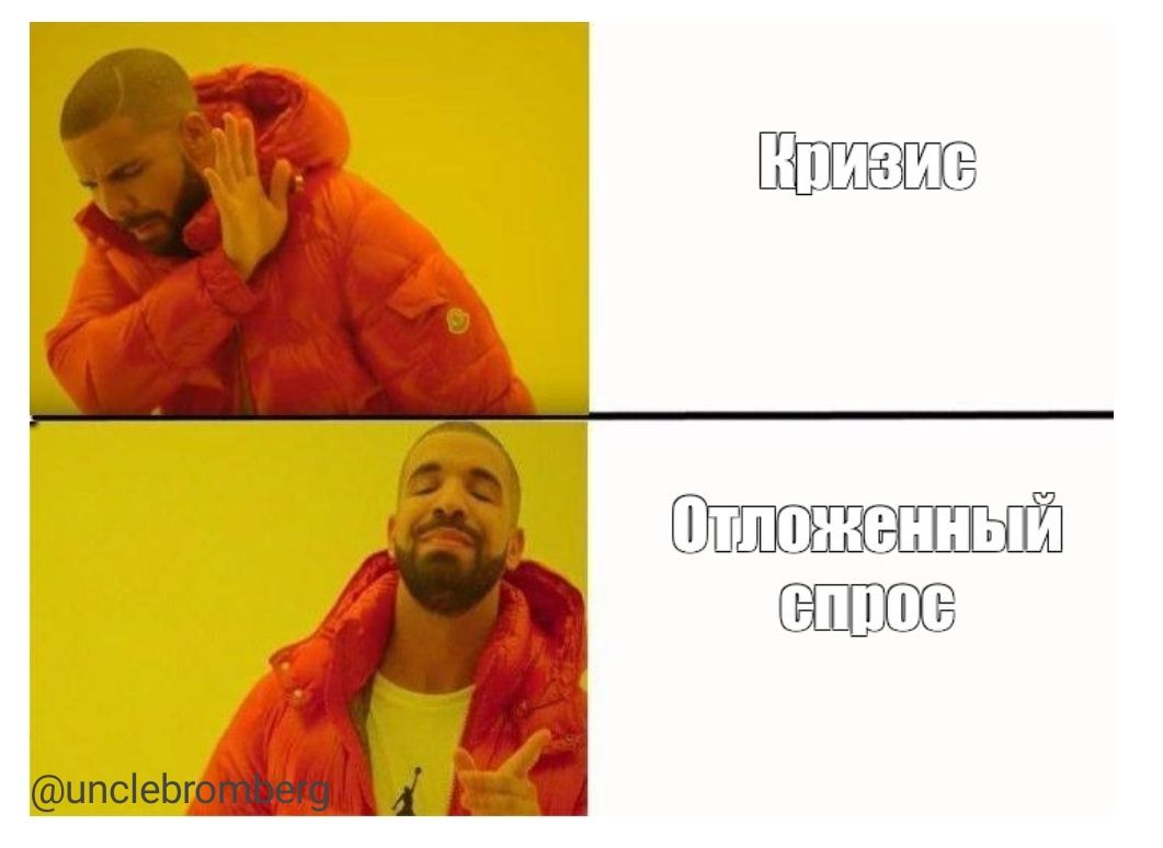 Отложенный спрос — неудовлетворённый спрос, обеспеченный свободными денежными средствами при отсутствии товара. Иными словами, когда очень хочется посидеть в любимом пабе с друзьями, но приходится сидеть дома на самоизоляции. Тлен и безысходность. «Скоро, скоро всё снимут и тогда можно будет покутить» — звучит у многих в голове, как мантра (у меня уж точно).