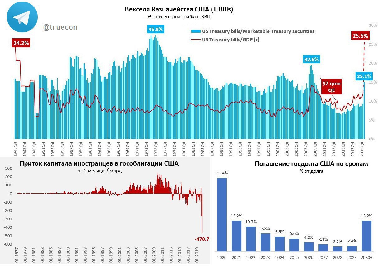 🗑 Более интересен рекорд по выводу средств иностранными держателями: в марте на $300 млрд, затем в апреля ещё на $177 млрд. ФРС за тот же период скупила гособлигаций на $1.45 трлн.