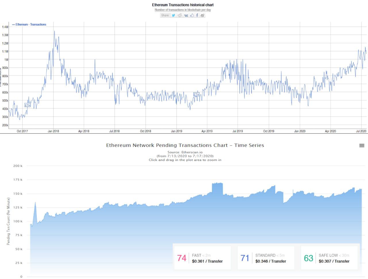 Следуя последним данным, количество ежедневных транзакций уже приблизилось к пику, который наблюдался в январе 2018 года. Мемпул также трещит по швам: 150 000 транзакций находятся в ожидании. Комиссии в моменте превышают $15.