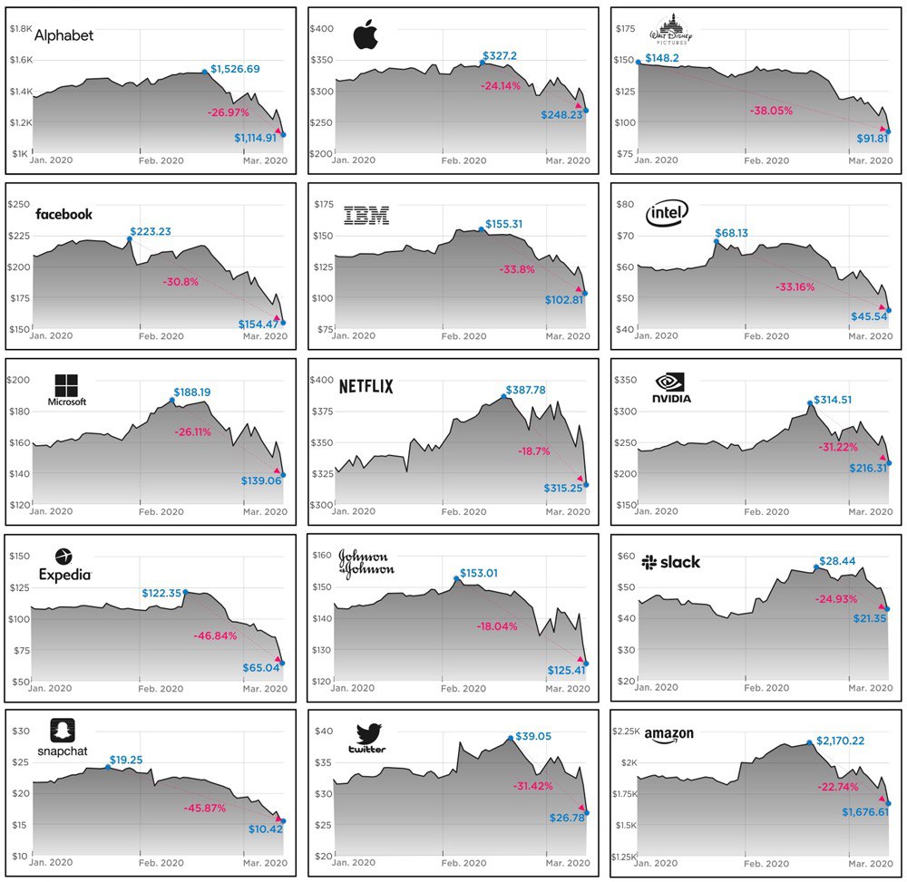 Коронавирусная паника охватывает мир, заставляя правительства предпринимать беспрецедентные шаги для замедления пандемии. Школы закрыты, бары закрыты, а общественные мероприятия отменены. Мир, вероятно, вступит в серьезную рецессию, в результате чего цены на акции резко упадут, когда люди обналичат и продадут всё. Вот последние сведения о степени ущерба, нанесенного ценам на акции нескольких ключевых компаний.