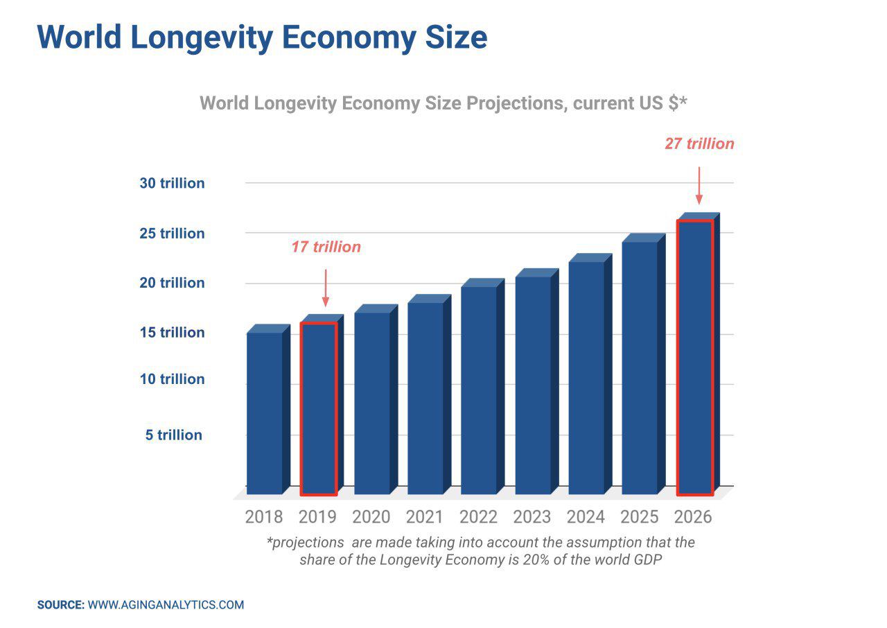 👨🔬 Исследования Aging Analytics показывают, что экономика, связанная со старением и продлением жизни, к 2026 году составит $27 трлн — речь о суммарных вложениях и/или капитализации компаний этого сектора.