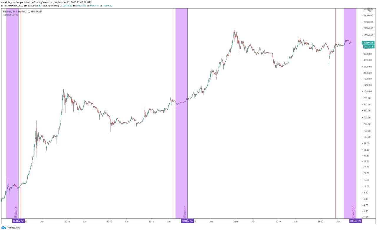 Оказывается халвинг биткоина и выборы президента США проходят примерно в одно и то же время третий год подряд.