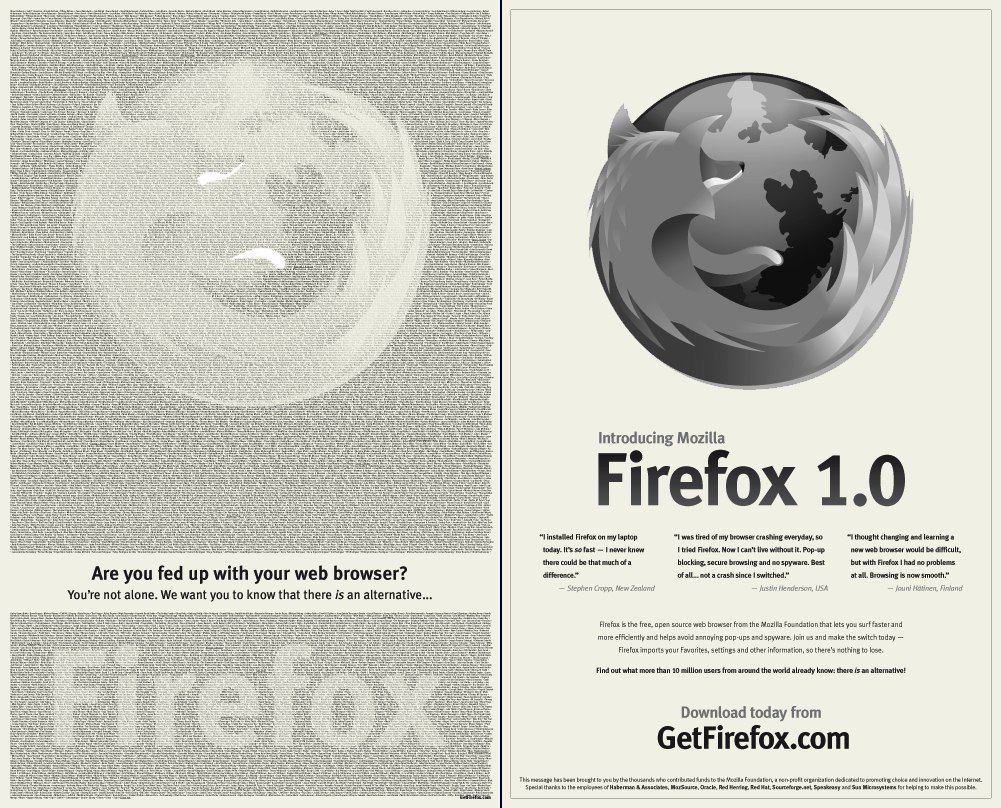 🦊 Иллюстрация к сегодняшнему материалу — материал на полную страницу The New York Times от ноября 2004 года. Более 10,000 человек со всего мира скинулись на эту рекламу, чтобы поздравить браузер с днём рождения.