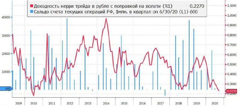 Керри-трейд в российские облигации федерального займа (ОФЗ) был одним из важных факторов привлекательности рубля для спекулянтов — в 2018–2019 годах они получали лишние 5% только на разнице процентных ставок. Весной этого года ФРС обнулила ставки, и спред между краткосрочными ставками в рублях против доллара достиг 6%. Затем ЦБ России запустил свой цикл снижения ставок до 4,25%, и спред ушел ниже 4% (по длинным бондам сжатие спреда было еще большим: с 7,5% до ниже 5%).