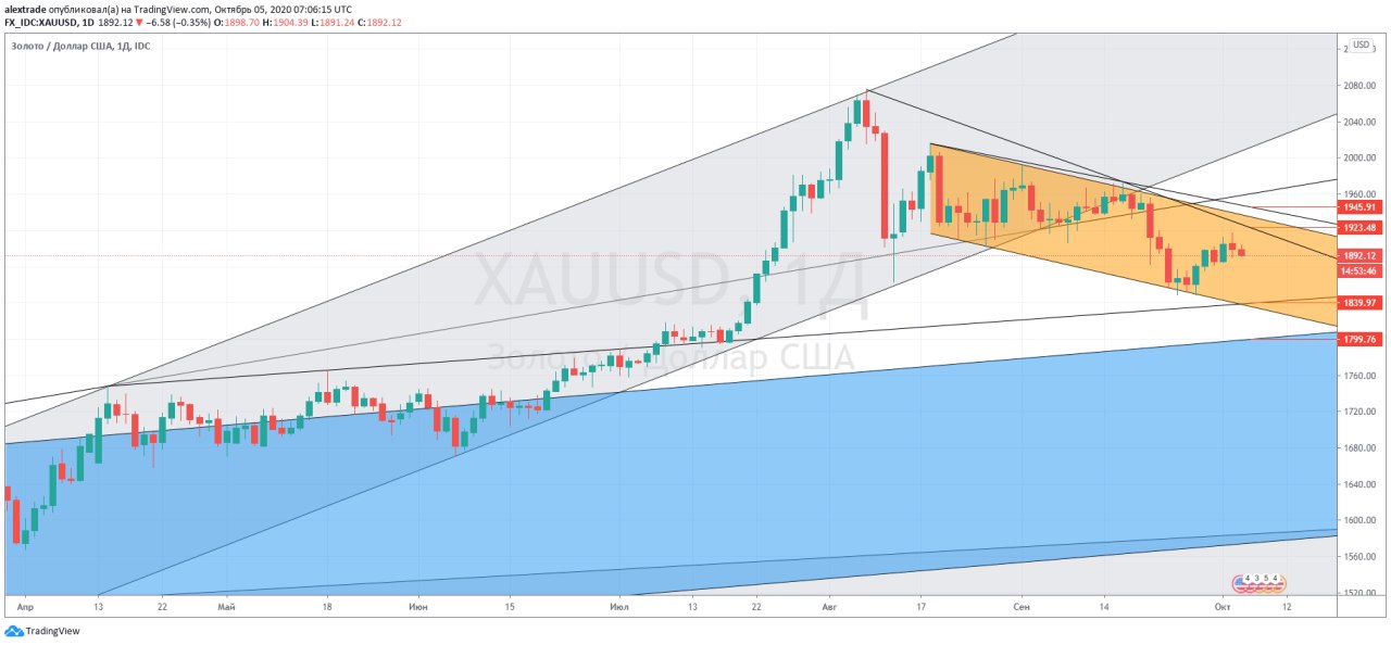 Золото дневной тайминг, 1892 в моменте, падает золото, попадать ему надо до 1840 и 1800. Золото попадает, пока индекс доллара DXY будет продолжать свой отскок вверх. Из серого апканала мы вышли вниз 17-21 сентября, выходили из него тяжело. Пока инициатива за медведями, сверху 1923-1945. Думаю снижение золото пока продолжится, в граница голубого апканала 1799 (сейчас) выступает ориентиром для цели снижения золота, 1840 промежуточный уровень. @pro_dengu #Золото