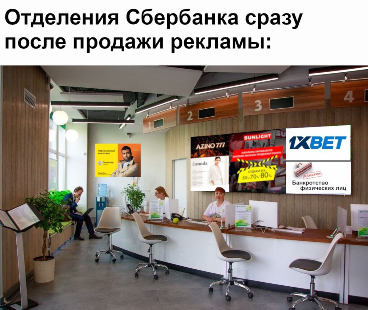 Интересно, а прорекламирует ли Сбер другой банк? Или аккуратно пошлет, приведя какие-то странные формулировки отказа? А как насчет рекламы компаний по банкротству физических лиц? Хороший тандем у них выйдет. Ну, а если вообще вдаться в крайности, то было бы совсем смешно, если ты заходишь в Сбер, а там на этих ЖК-панелях светятся фразы а-ля «Большие выигрыши! Быстрые выплаты!». Просто, кажется, только у букмекеров и хватит денег на рекламу в Сбере.