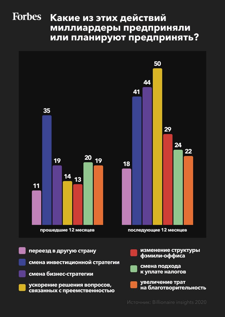 В течение последнего года немногим больше трети миллиардеров (35%) изменили свою инвестиционную стратегию (41% планирует сделать это в ближайшие 12 месяцев). Свой подход к уплате налогов изменили 20% (планируют — 24%), свою бизнес-стратегию 19% (планируют - 44%), больше тратили на благотворительность 19% (планируют увеличить траты 22%). Но больше всего героев глобального рейтинга Forbes волнуют вопросы преемственности — ими вплотную планируют заняться в ближайшее время 55% опрошенных бизнесменов. «Как и многие из нас, они нашли время во время изоляции, чтобы обсудить договоренности внутри семьи и подумать о смерти, переоценить свои бизнес- и инвестиционные стратегии. В результате произошел заметный всплеск планирования преемственности», — говорится в докладе.
