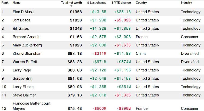 ⚡️ Богатейший человек планеты теперь, если верить списку, — Илон Маск, его состояние $195 млрд. Причина скачка проста и понятна: рост акций Tesla на 700% с лишним.