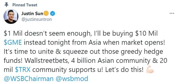 Тут CEO Tron Джастин Сан разошёлся в твиттере и заявил, что купит акций GME на $10 млн, «чтобы выдавить эти жадные хедж-фонды!»