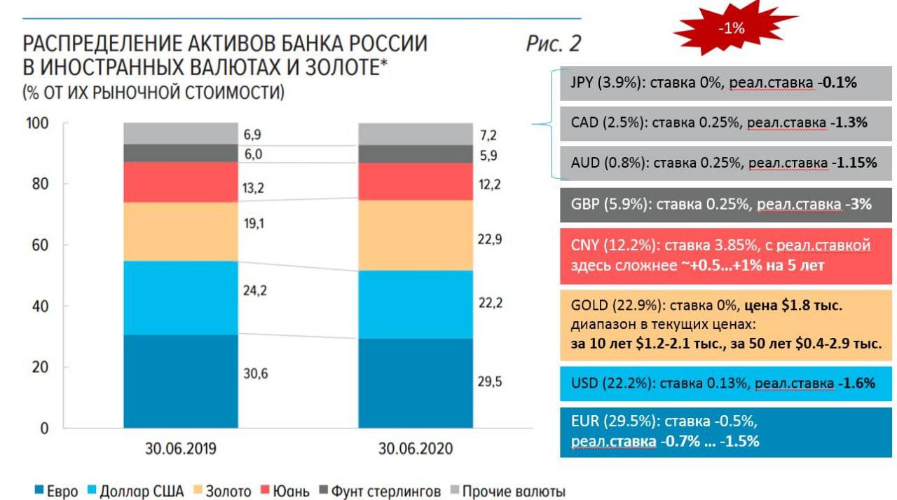 🏦 Центральными банками мира накоплено около $12.3 трлн валютных резервов и еще около 34 тыс. тонн золота на ~$2 трлн. Из всех валютных резервов около 90% размещены в валюты с отрицательными реальными ставками на горизонте ближайших 5 лет.