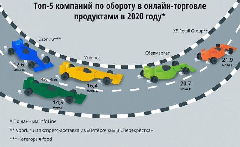 📏 Infoline выпустили рейтинг топ-5 по обороту в онлайн-торговле продуктами в 2020 году. В него вошли Х5, Сбермаркет, Утконос, ВкусВилл и Озон с показателями от ₽21.9 до ₽12.6 млрд.