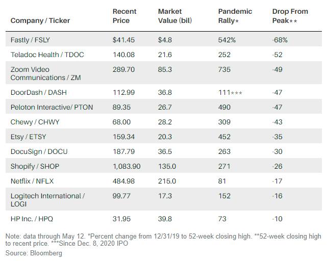 Президент США Джо Байден добивается вакцинации 70% взрослых американцев к 4 июля. Вакцинированные смогут везде ходить без масок. На фоне этих новостей инвесторы выходят из акций компаний «домоседов». При этом инвесторы хотят разобраться: какие компании, поднявшиеся на карантине, смогут остаться наверху, а кого отлив унесёт обратно туда, где они были до пришествия ковида.