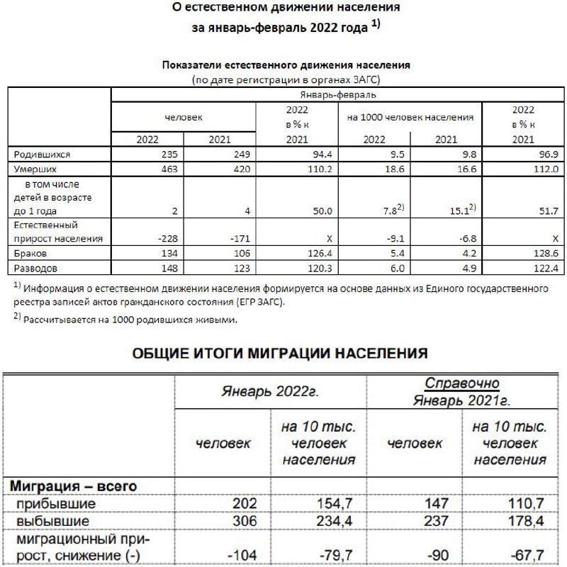 Число умерших за указанный период времени (462 чел.) почти в два раза превысило число родившихся (235 чел.). Естественная убыль населения, таким образом, выросла до минус 228 чел. Для сравнения: в аналогичном периоде прошлого года этот показатель составлял минус 171 чел.