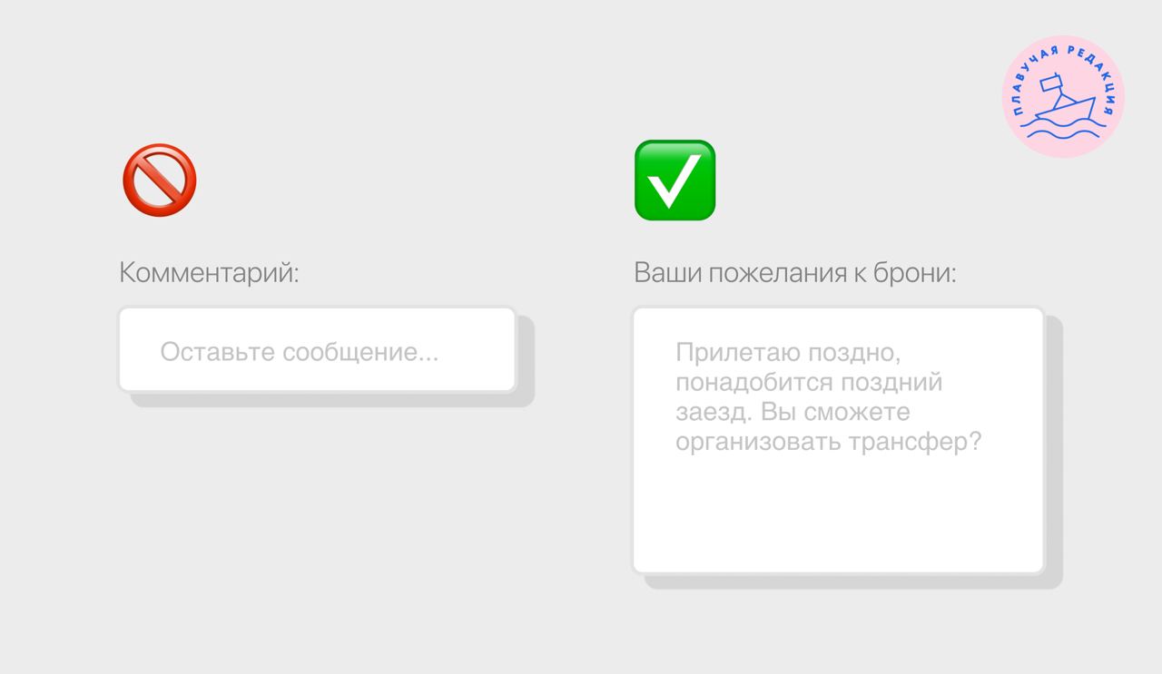 Плейсхолдер. Ещё одна возможность, которую не стоит упускать — предзаполнить поле примером типичного текста. Это иногда намного лучше объясняет, какого типа сообщение от него ждут. Пусть это будет и узкий пример, но реалистичный. Может быть, напомнит что-то, о чём пользователь забыл подумать.