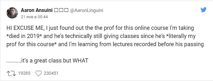 Про смерть преподавателя узнал один из студентов и написал в твиттер. Несмотря на это университет продолжил использовать записанные лекции с мужчиной как в отдельном онлайн-курсе, так и в каталоге онлайн-занятий.