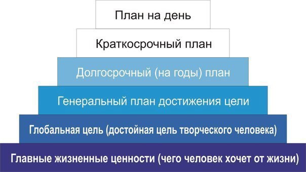 1. Главные жизненные ценности. Это фундаментпирамиды. Их ясное определение для себя, задает вектор направленности жизни. Какой вы видите свою жизнь? Чего хотите от нее получить? Какой след после себя хотели бы оставить?