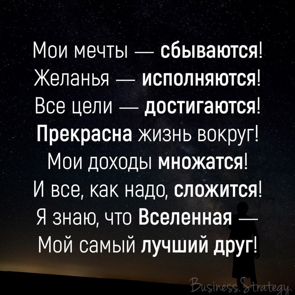 10. Мечты − это главное в твоей жизни! Мечты профессионально превращай в бизнес-программы и реализуй их на полный результат! Каждая, профессионально разработанная программа, должна содержать весь расчёт до самого полного желаемого результата. Только так и сбываются мечты!