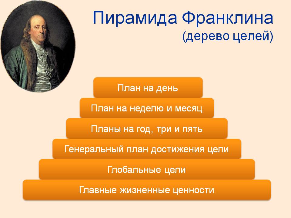 Бенджамина Франклина отличала фантастическая работоспособность и уникальная целеустремленность. В возрасте 20 лет он составил план достижения целей на всю жизнь вперед. На протяжении всей жизни он следовал этому плану, четко планируя каждый день. Его план достижения целей получил название «пирамида Франклина» и выглядит примерно так: