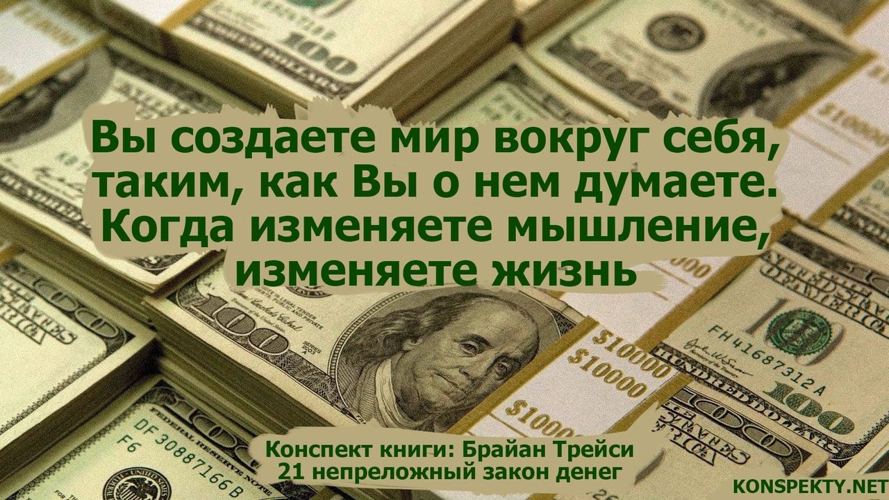 Человек не может менять обстоятельства жизни, но способен поменять отношение, мнение, мысли. Жизнь человека движется в направлении наиболее сильной мысли, концентрации внимания, полезно учиться направлять мышление в сторону успеха, процветания, счастья. Думая позитивно, создаём новый мир, а планируя новые достижения, создаём фундамент для новой жизни, будущих успехов.