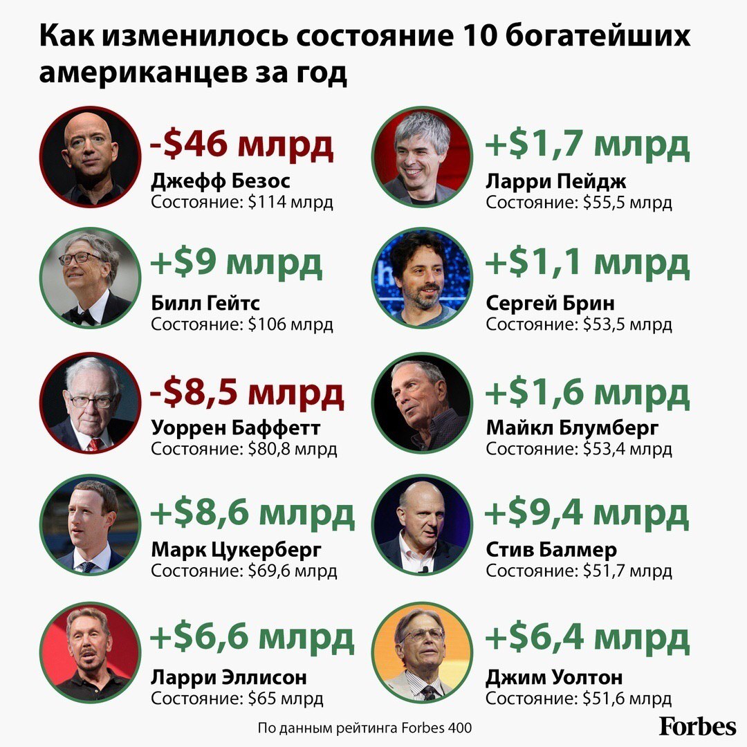 Из 10 богатейших американцев за год состояние уменьшилось только у двух: Джеффа Безоса (из-за развода с женой) и Уоррена Баффетта (часть денег он передал на благотворительность).