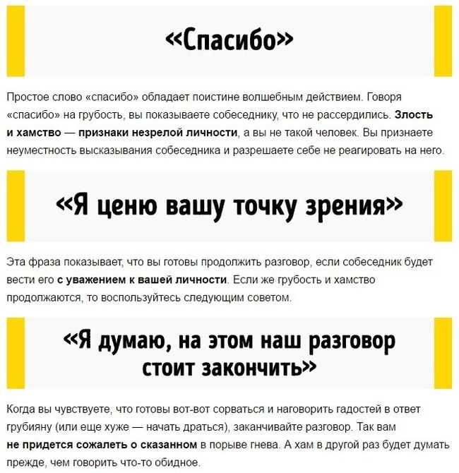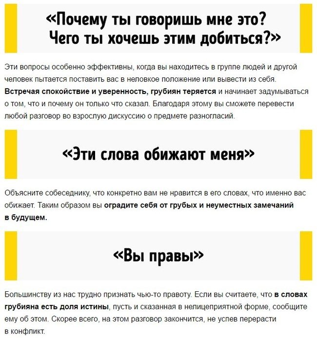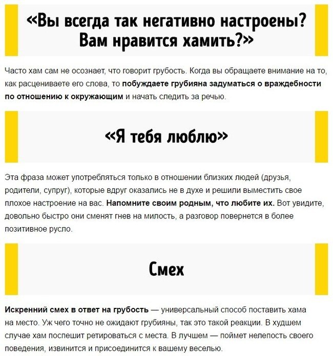Как можно нейтрализовать грубияна и хама? Ну, прежде всего ( исходя из собственного опыта) постараться не реагировать на хама и грубияна, правда, это сложно! Но, можно! - есть такая фраза :" А зачем Вы это говорите( делаете)?" Именно "зачем", а не "почему". На вопрос "Почему", ваш оппонент ответит :"Да потому что....". А на вопрос "Зачем"...как то сразу и не ответить, обычно это слово вводит оппонента в небольшой ступор и человек начинает думать, что бы такого сказать... и... время упущено. А потом либо конфликт гасится, либо вы спокойно уходите,"покидая поле боя", и ваши нервы в порядке. Есть еще несколько фраз, которые помогут избежать ссоры/ конфликта где бы это не происходило: в офисе, на улице, особенно в транспорте, и даже дома.