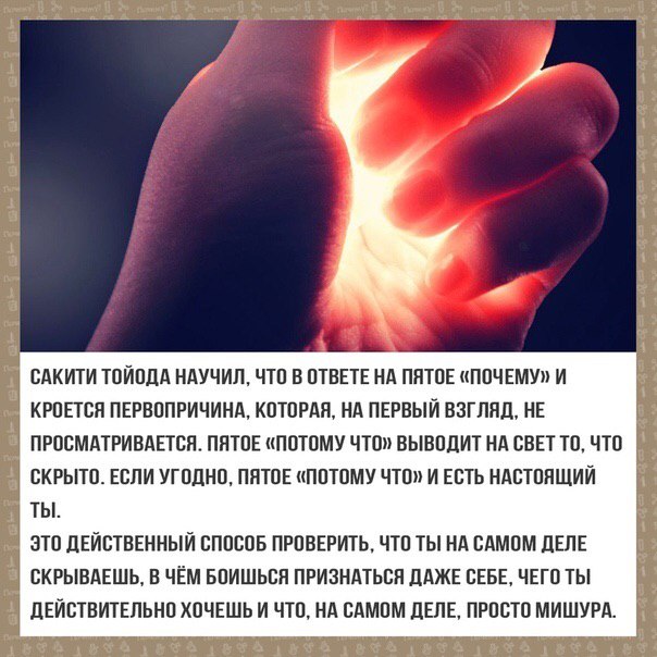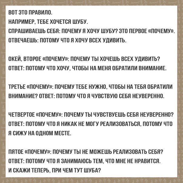 Иногда эта цепочка помогает. И если одному человеку помогла, то поможет и другому. Как говориться, ответ в конце головоломки. Чтобы добиться эффекта в деле , в бизнесе, да во всем , надо простроить весь путь от начала и до конца, постараться учесть все риски, дойти до сути, то есть до "пятого почему".