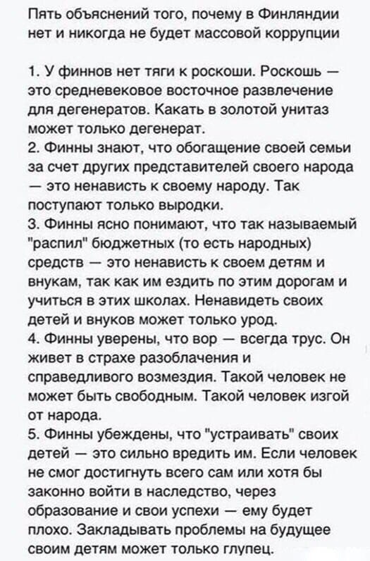 Нашла у собратьев по бизнес идеям вот такие интересные факты: Почему в Финляндии нет и не будет коррупции? Хотя сказать, что коррупция процветает только в какой то отдельно взятой стране нельзя, она есть везде. Вопрос в том, в каком размере?!