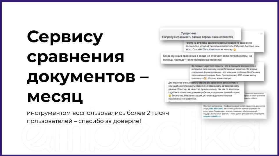 ▶️«Ребята из Embedika сделали классный сервис по сравнению документов, который уже можно потестить. Работает быстрее, чем Word». Екатерина Лобышева, юрист Eversheds Sutherland.