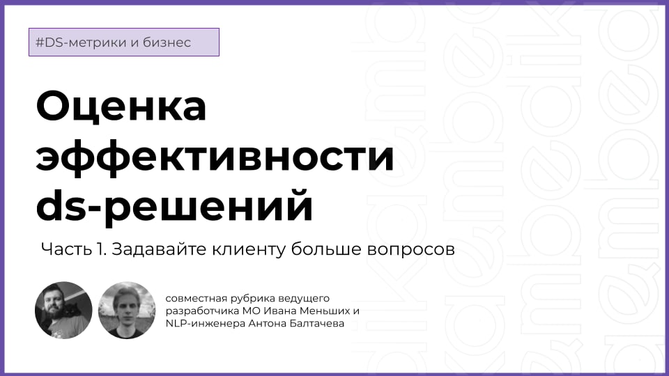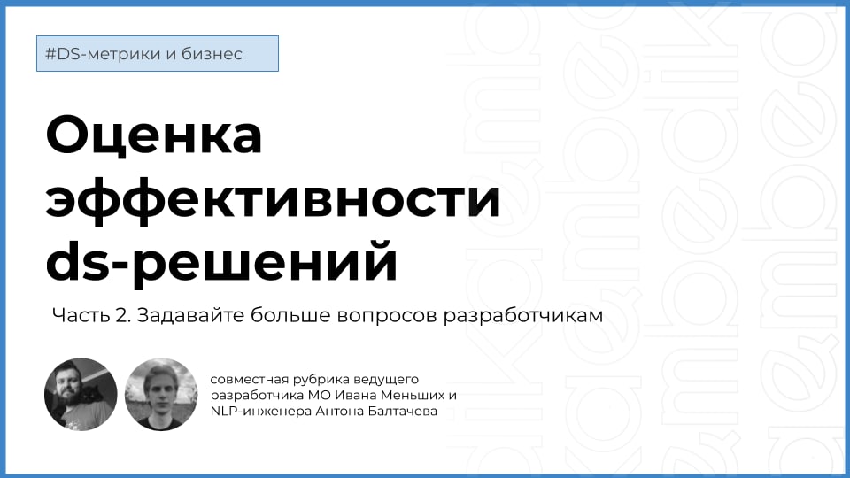 Оценка эффективности data science-решения часто вызывает много вопросов, поскольку на этом этапе заказчик и разработчики говорят на разном языке. Как избежать недопонимания и оценить пользу продукта расскажут ведущий разработчик машинного обучения Иван Меньших и NLP-инженер Антон Балтачев в совместной рубрике “DS-метрики и бизнес”.