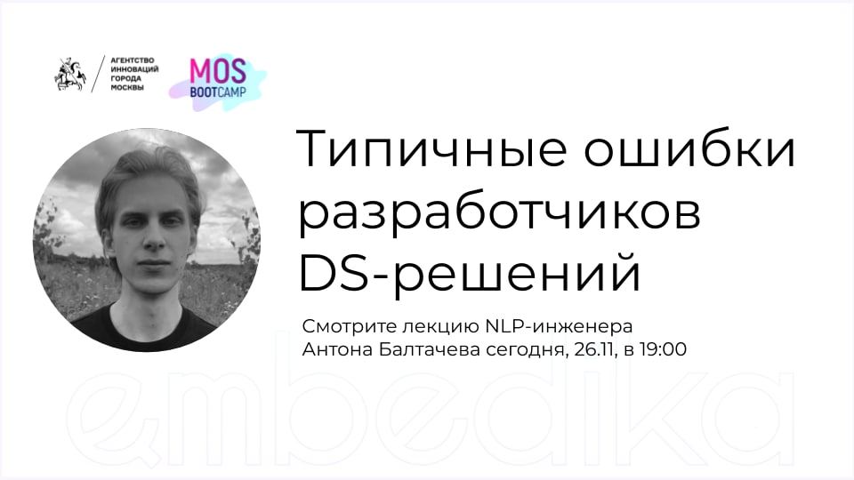 Сегодня в 19:00 NLP-инженер Антон Балтачев поделится самым ценным опытом при разработке data science-решений, а именно — опытом того, как делать не надо:)