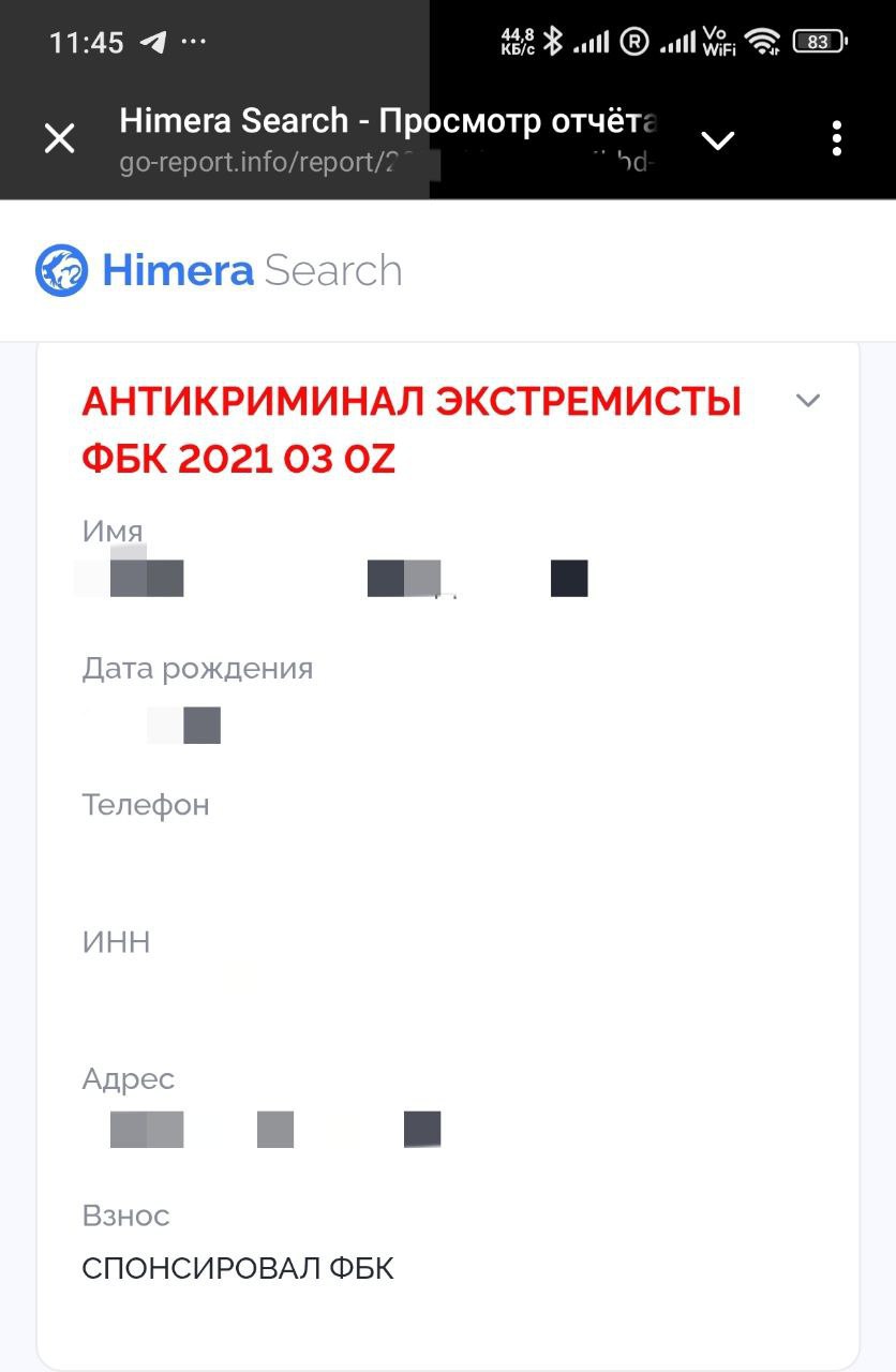 Подписчик Эмигрицепса решил проверить себя через бот для пробива данных Himera и выяснил интересную деталь. В одной из баз он числится экстремистом за спонсирование ФБК. Сами пожертвования были сделаны еще в 2016-2017 гг.
