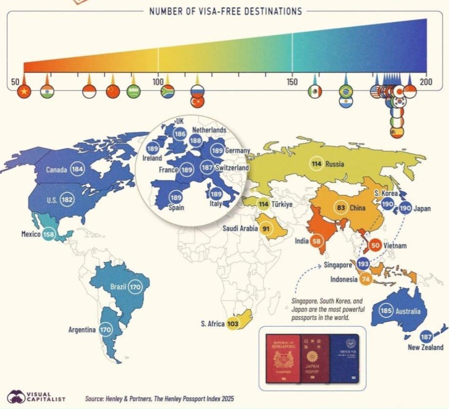 В 2025 г. на первом месте по данным обновленного рейтинга паспортов Henley & Partners оказался Сингапур: его граждане могут без визы посещать 193 страны. Чуть позади — Япония и Южная Корея с доступом в 190 направлений.