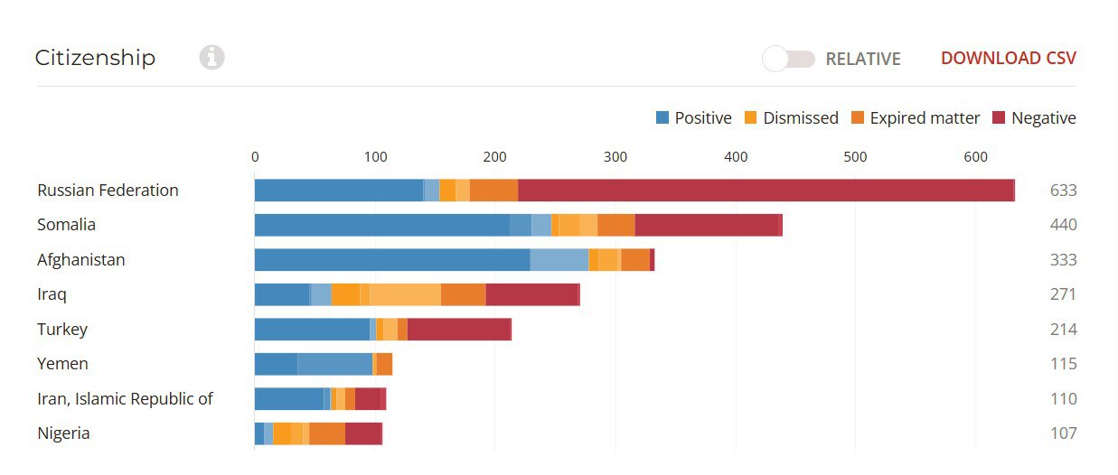 Об отношении миграционных властей Суоми хорошо говорит статистика: это рассмотренные ходатайства об убежище и принятые решения в 2025-м году. Красный цвет — отказы.