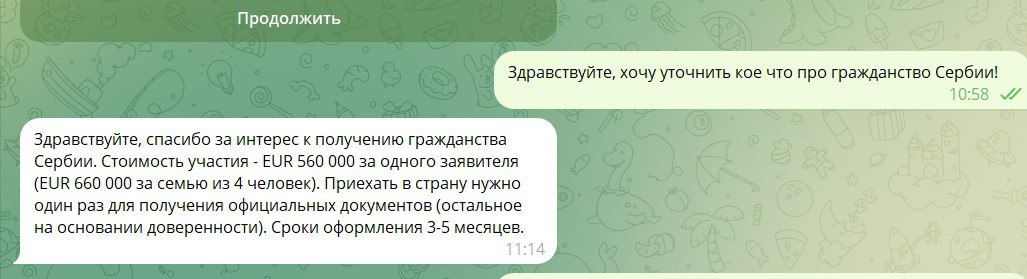 Подписчица увидела в одном из русскоязычных телеграм-каналов любопытную рекламу: предлагают быстро получить гражданство Сербии. Также утверждается, что документ выдают согласно статье 19 Закона о гражданстве, позволяющей предоставлять паспорт иностранцам, «представляющим особый интерес для страны».