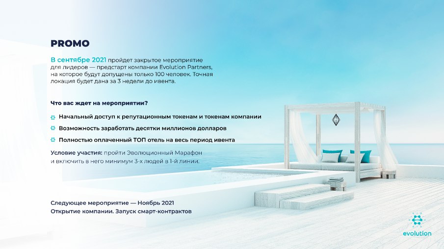 В сентябре 2021 пройдет закрытое мероприятие для лидеров — предстарт компании Evolution Partners, на которое будут допущены только 100 человек. Точная локация будет дана за 3 недели до ивента.