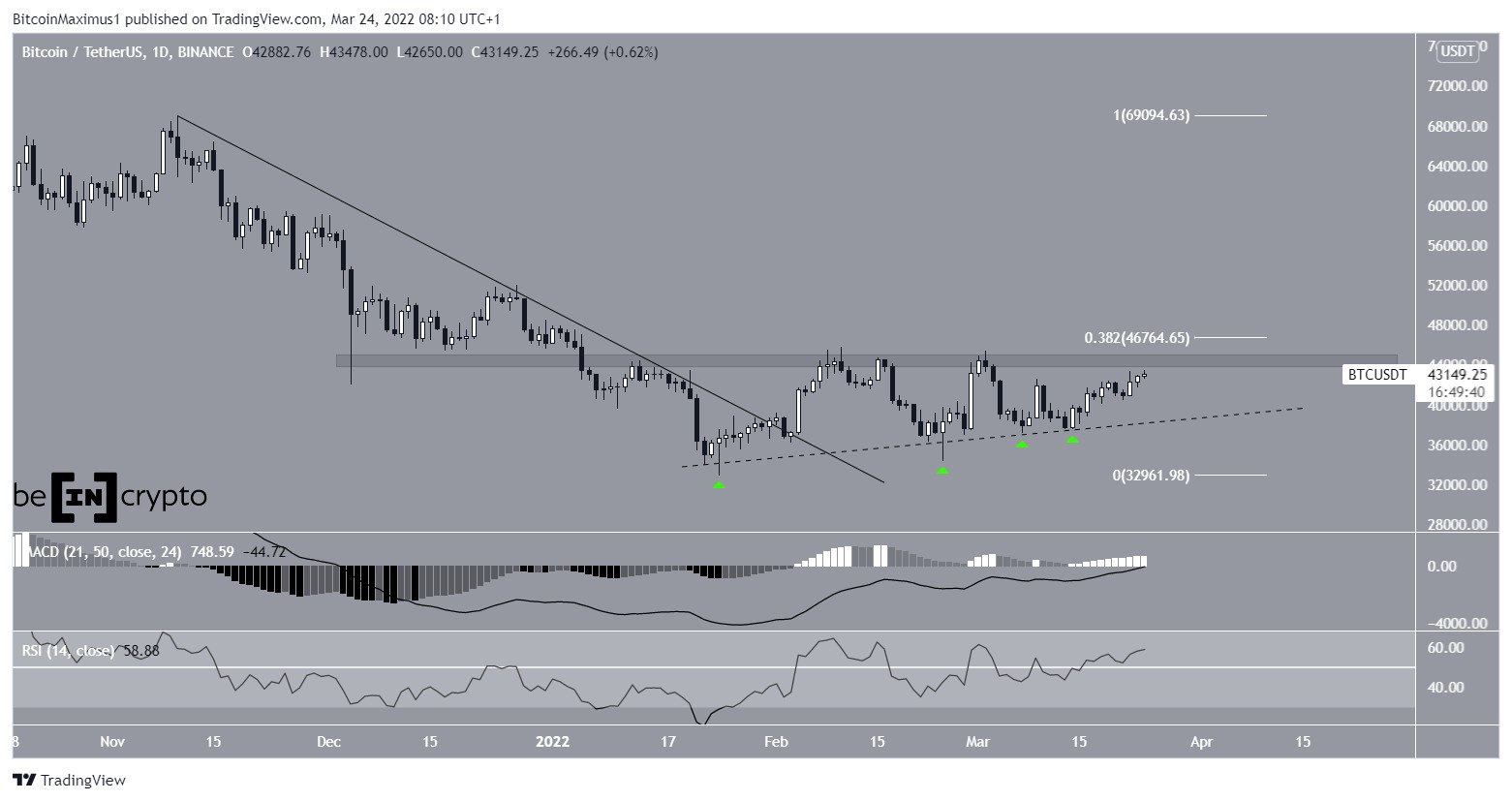 Биткоин с 24 января движется вдоль линии восходящей поддержки (пунктир). Цена уже четыре раза проверяла эту отметку на прочность. В последний раз это произошло 14 марта (зеленый значок). За этим последовал отскок, который дал начало текущей фазе роста BTC.