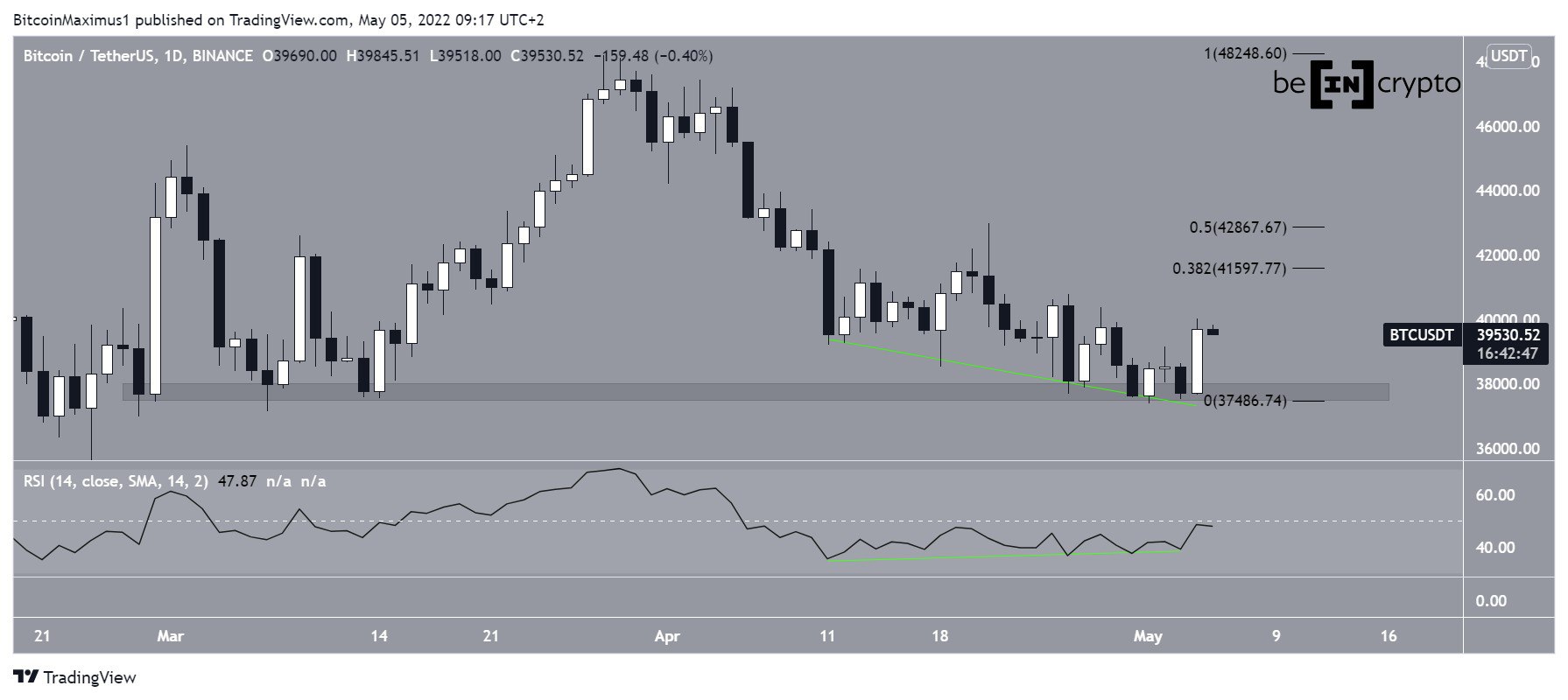 4 мая BTC существенно вырос и сформировал свечу бычьего поглощения, ненадолго прорвавшись выше отметки $40 000. Этот отскок произошел после того, как графики подали сигналы бычьей дивергенции, и цена протестировала на прочность в качестве поддержки горизонтальную область $37 800.