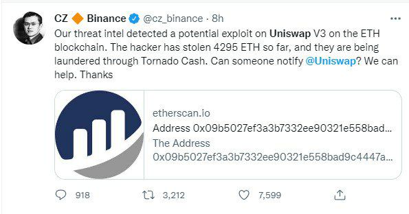 Ночью CEO Binance выпустил твит о том, что Uniswap подверглась атаке и хакер украл 4295 ETH.